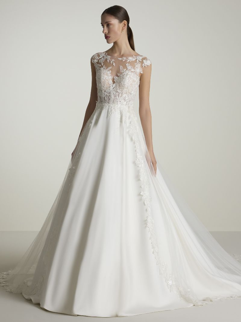 Abito da sposa romantico ROSA CLARA' Incantevole abito da sposa a manica lunga in un meraviglioso pizzo geometrico. La scollatura della schiena e profonda e la gonna in tulle è leggera e voluminosa