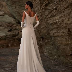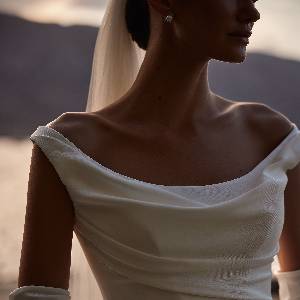 Abito da sposa a trapezio in raso , con scollatura drappeggiata e spalline ampie . Il corsetto scolpisce il punto vita, mentre la gonna fluida si apre in un ampio strascico.