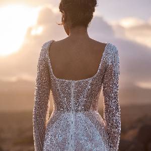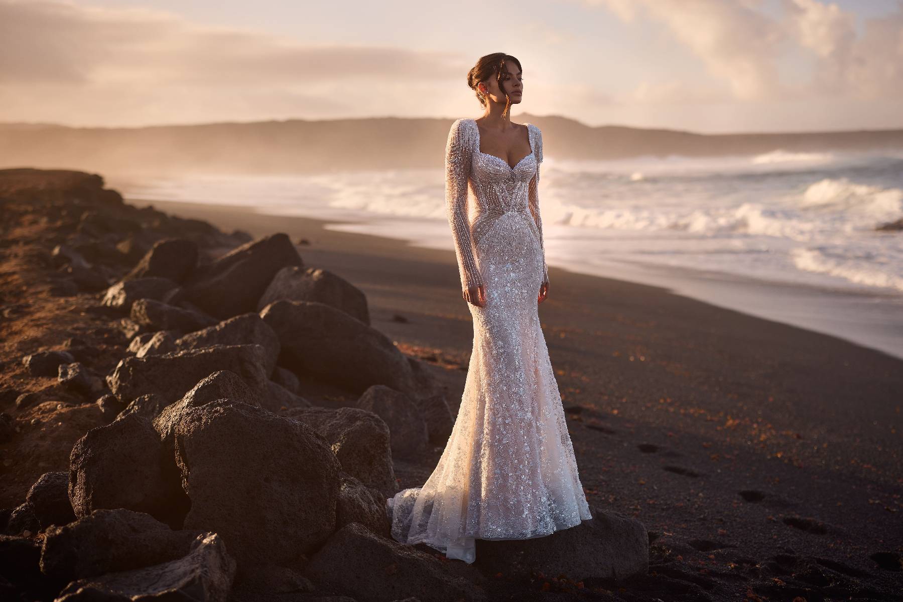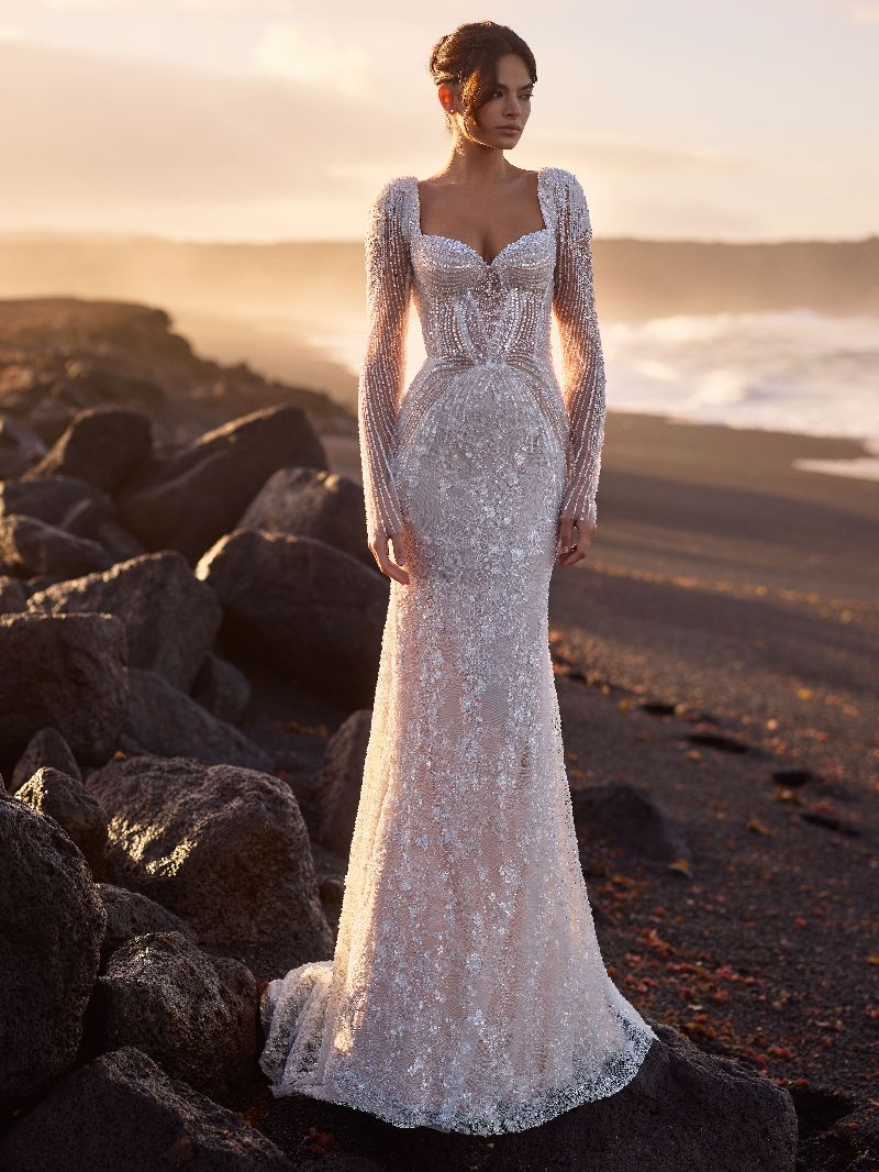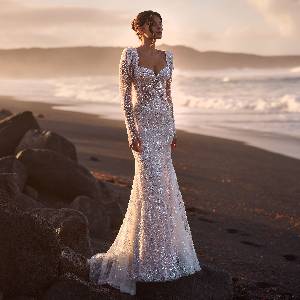 Elegante abito a sirena in pizzo semitrasparente, impreziosito da ricami artigianali di paillettes e perline. Il corpetto con scollatura a cuore e maniche lunghe trasparenti valorizza la silhouette, mentre la gonna aderente con sottogonna nude e strascico