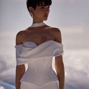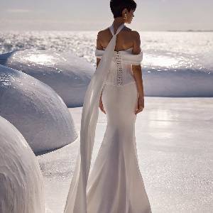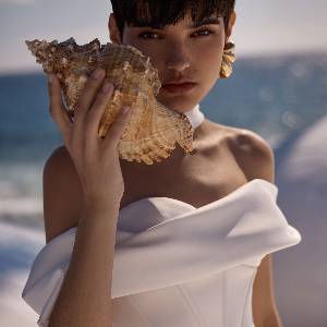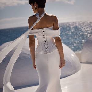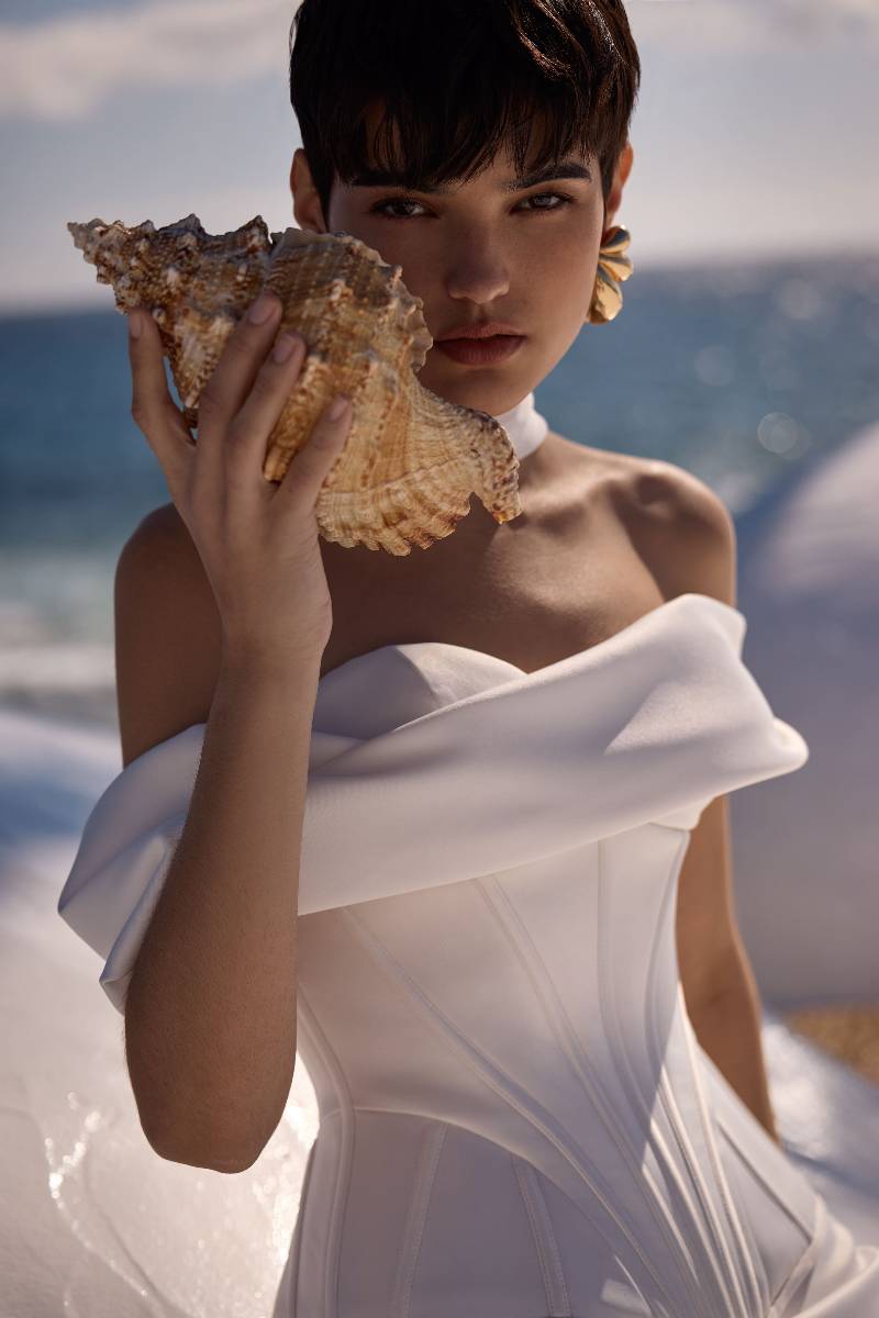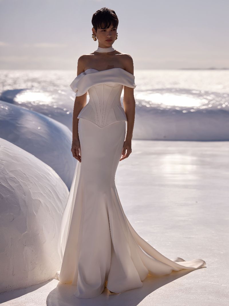 Abito da sposa sofisticato e femminile con corsetto strutturato con stecche e scollatura a cuore chiuso con lacci sul dietro, maniche oversize drappeggiate che lasciano le spalle scoperte.