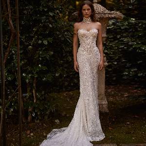Elegante abito da sposa a sirena realizzato in raffinato pizzo e arricchito da preziose perle