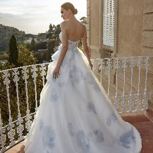 Romantico abito da sposa in organza in stile principesco con scollatura a cuore senza spalline con applicazione di delicati fiori colorati